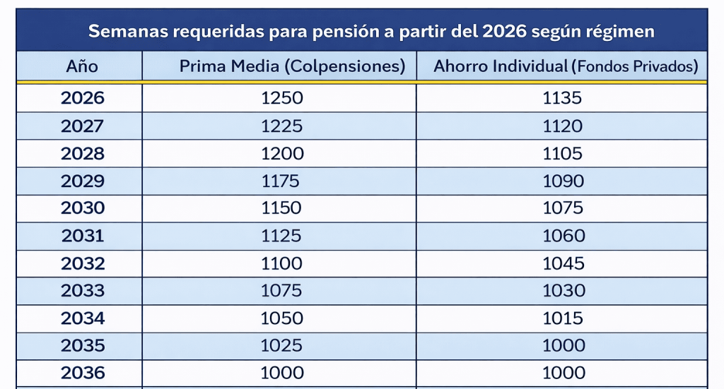 • Reducción gradual: El requisito bajará cada año en 25 semanas para Colpensiones y 15 semanas para los fondos privados, hasta llegar a 1.000 semanas en 2036.